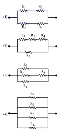 From the combination of resistors with resistance values \( R_1 = R_2 = R_3 = 5 \, \Omega \) and \( R_4 = 10 \, \Omega \), which of the following combination is the best circuit to get an equivalent resistance of 6 \( \Omega \)?