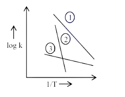 Consider the following plots of log of rate constant \( k (log k)\) vs \( \frac{1}{T} \) for three different reactions. The correct order of activation energies of these reactions is: