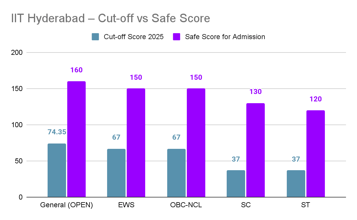 - Safe score for IIT Hyderabad is 150-160, irrespective of the category.