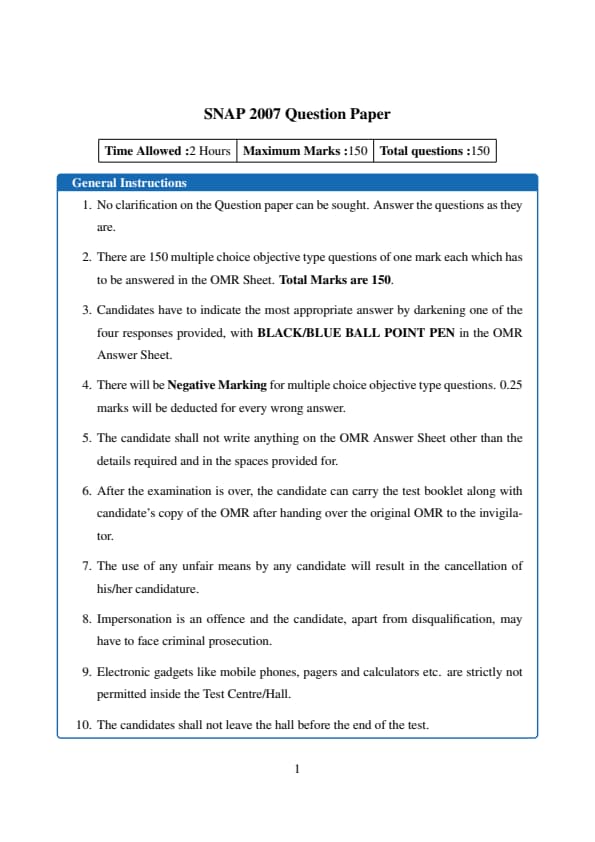 The SNAP 2007 Question Paper is now available for download with answer key and detailed solutions PDF. SNAP is conducted as a computer‑based test and divided into three sections: General English, Quantitative, Data Interpretation & Logical Reasoning. There is no sectional time limit, and each correct answer is awarded one mark, while each incorrect answer incurs a penalty of 0.25 marks.