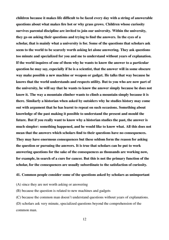 The world dismisses curiosity by calling it idle, or mere idle curiosity - even though curious persons are seldom idle. Parents do their best to extinguish curiosity in their children because it makes life difficult to be faced every day with a string of answerable questions about what makes fire hot or why grass grows. Children whose curiosity survives parental discipline are invited to join our university. Within the university, they go on asking their questions and trying to find the answers. In the eyes of a scholar, that is mainly what a university is for. Some of the questions that scholars ask seem to the world to be scarcely worth asking let alone answering. They ask questions too minute and specialized for you and me to understand without years of explanation. If the world inquires of one of them why he wants to know the answer to a particular question he may say, especially if he is a scientist, that the answer will in some obscure way make possible a new machine or weapon or gadget. He talks that way because he knows that the world understands and respects utility. But to you who are now part of the university, he will say that he wants to know the answer simply because he does not know it. The way a mountain climber wants to climb a mountain simply because it is there. Similarly a historian when asked by outsiders why he studies history may come out with argument that he has learnt to repeat on such occasions. Something about knowledge of the past making it possible to understand the present and mould the future. But if you really want to know why a historian studies the past, the answer is much simpler: something happened, and he would like to know what. All this does not mean that the answers which scholars find to their questions have no consequences. They may have enormous consequences but these seldom form the reason for asking the question or pursuing the answers. It is true that scholars can be put to work answering questions for the sake of the consequences as thousands are working now, for example, in search of a cure for cancer. But this is not the primary function of the scholar, for the consequences are usually subordinate to the satisfaction of curiosity
