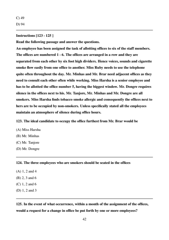 An employee has been assigned the task of allotting offices to six of the staff members. The offices are numbered 1 - 6. The offices are arranged in a row and they are separated from each other by six foot high dividers. Hence voices, sounds and cigarette smoke flow easily from one office to another. Miss Ruby needs to use the telephone quite often throughout the day. Mr. Minhas and Mr. Brar need adjacent offices as they need to consult each other often while working. Miss Harsha is a senior employee and has to be allotted the office number 5, having the biggest window. Mr. Dongre requires silence in the offices next to his. Mr. Tanjore, Mr. Minhas and Mr. Dongre are all smokers. Miss Harsha finds tobacco smoke allergic and consequently the offices next to hers are to be occupied by non-smokers. Unless specifically stated all the employees maintain an atmosphere of silence during office hours.