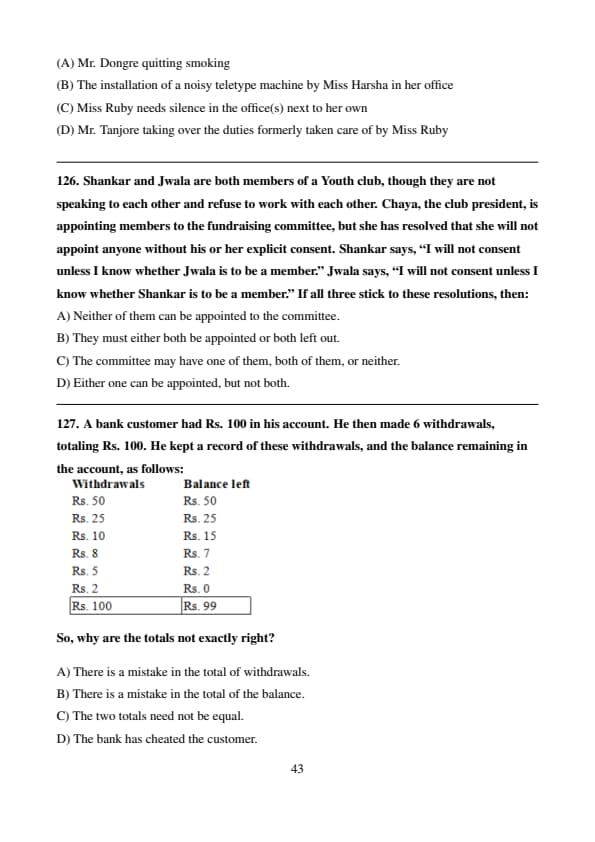 A bank customer had Rs. 100 in his account. He then made 6 withdrawals, totaling Rs. 100. He kept a record of these withdrawals, and the balance remaining in the account, as follows: