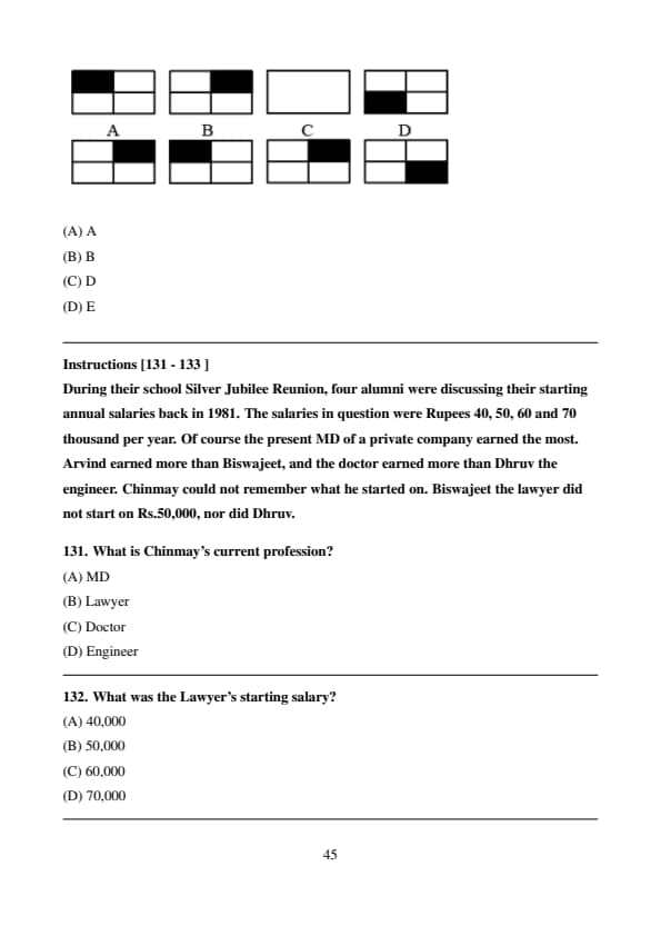 During their school Silver Jubilee Reunion, four alumni were discussing their starting annual salaries back in 1981. The salaries in question were Rupees 40, 50, 60 and 70 thousand per year. Of course the present MD of a private company earned the most. Arvind earned more than Biswajeet, and the doctor earned more than Dhruv the engineer. Chinmay could not remember what he started on. Biswajeet the lawyer did not start on Rs.50,000, nor did Dhruv.