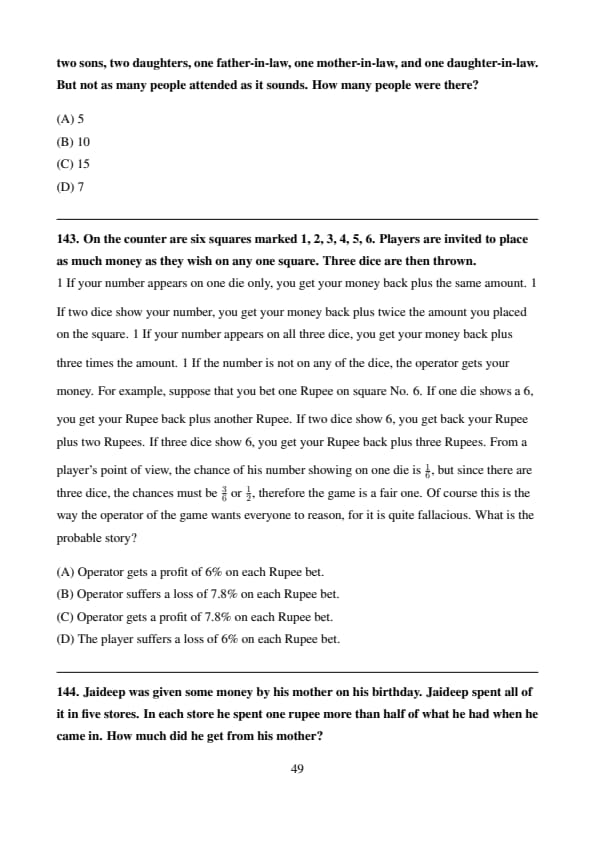 1 If your number appears on one die only, you get your money back plus the same amount. 1 If two dice show your number, you get your money back plus twice the amount you placed on the square. 1 If your number appears on all three dice, you get your money back plus three times the amount. 1 If the number is not on any of the dice, the operator gets your money. For example, suppose that you bet one Rupee on square No. 6. If one die shows a 6, you get your Rupee back plus another Rupee. If two dice show 6, you get back your Rupee plus two Rupees. If three dice show 6, you get your Rupee back plus three Rupees. From a player’s point of view, the chance of his number showing on one die is 1/6, but since there are three dice, the chances must be 3/6 or 1/2, therefore the game is a fair one. Of course this is the way the operator of the game wants everyone to reason, for it is quite fallacious. What is the probable story?