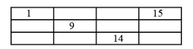Eight of the nine numbers \(2,3,4,5,7,10,11,12,13\) are to be placed in the empty cells of the \(3\times4\) array (with \(1,9,14,15\) already placed) so that the arithmetic average of the numbers in each row and each column is the same integer. Which one number must be left out?