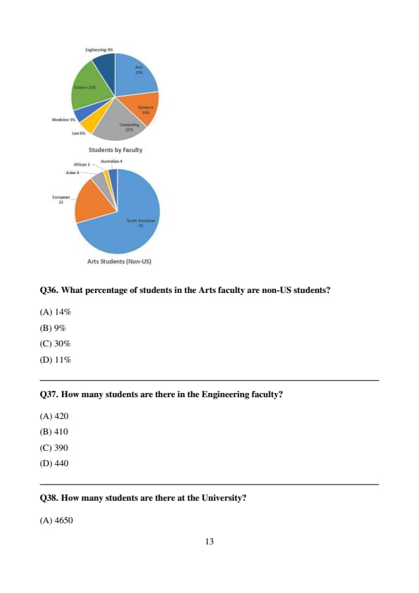 The pie charts below show the percentage of students in each faculty at North West University and the number of non-US students in the Arts faculty. These percentages have been rounded to the nearest whole number. There are a total of 1049 students in Arts faculty. Use this information to answer the following questions.