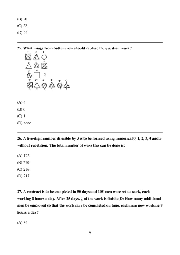 A contract is to be completed in 50 days and 105 men were set to work, each working 8 hours a day. After 25 days, \(\tfrac{2}{5}\) of the work is finishe(D) How many additional men be employed so that the work may be completed on time, each man now working 9 hours a day?