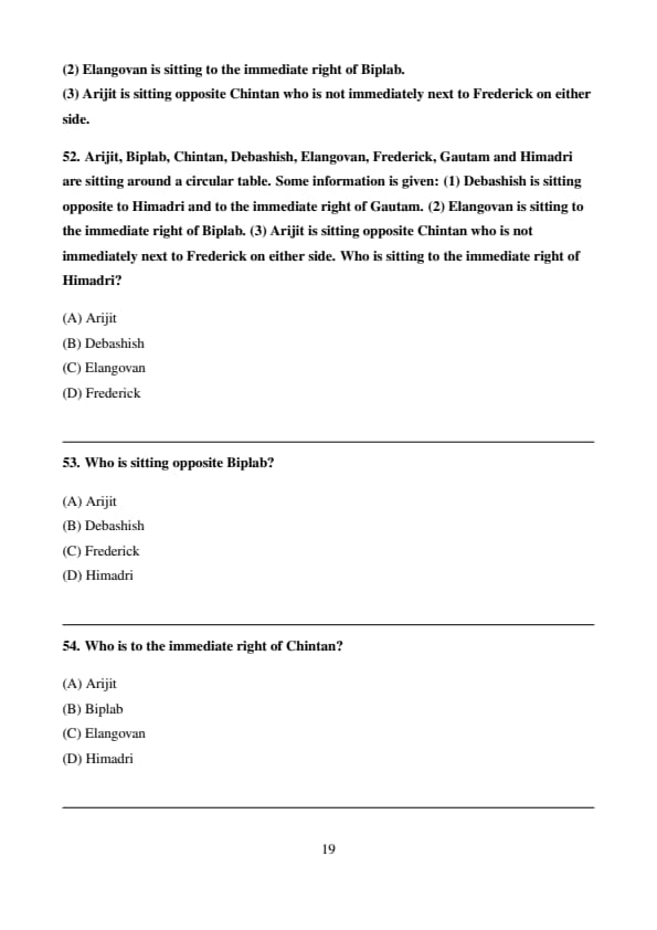 Arijit, Biplab, Chintan, Debashish, Elangovan, Frederick, Gautam and Himadri are sitting around a circular table. Some information is given: