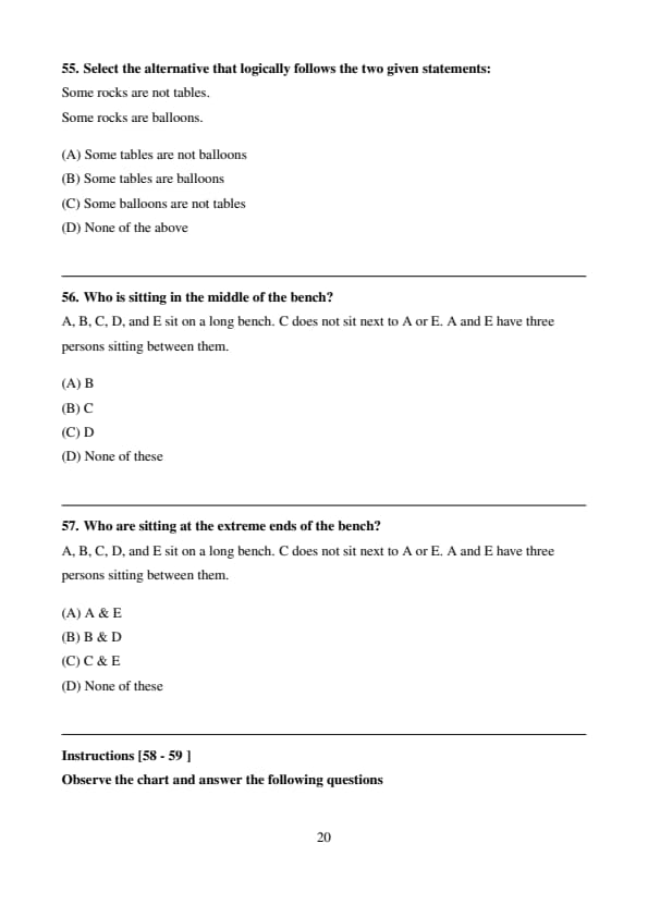 A, B, C, D, and E sit on a long bench. C does not sit next to A or E. A and E have three persons sitting between them.