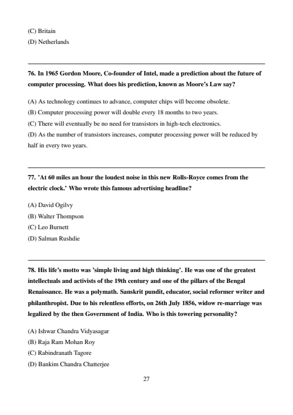His life's motto was 'simple living and high thinking'. He was one of the greatest intellectuals and activists of the 19th century and one of the pillars of the Bengal Renaissance. He was a polymath. Sanskrit pundit, educator, social reformer writer and philanthropist. Due to his relentless efforts, on 26th July 1856, widow re-marriage was legalized by the then Government of India. Who is this towering personality?