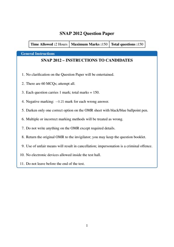 The SNAP 2012 Question Paper is now available for download with answer key and detailed solutions PDF. SNAP is conducted as a computer‑based test and divided into three sections: General English, Quantitative, Data Interpretation & Logical Reasoning. There is no sectional time limit, and each correct answer is awarded one mark, while each incorrect answer incurs a penalty of 0.25 marks.