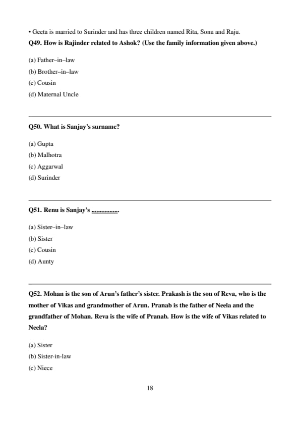 Mohan is the son of Arun’s father’s sister. Prakash is the son of Reva, who is the mother of Vikas and grandmother of Arun. Pranab is the father of Neela and the grandfather of Mohan. Reva is the wife of Pranab. How is the wife of Vikas related to Neela?
