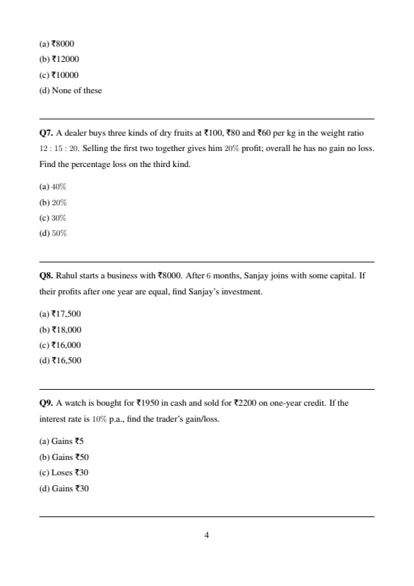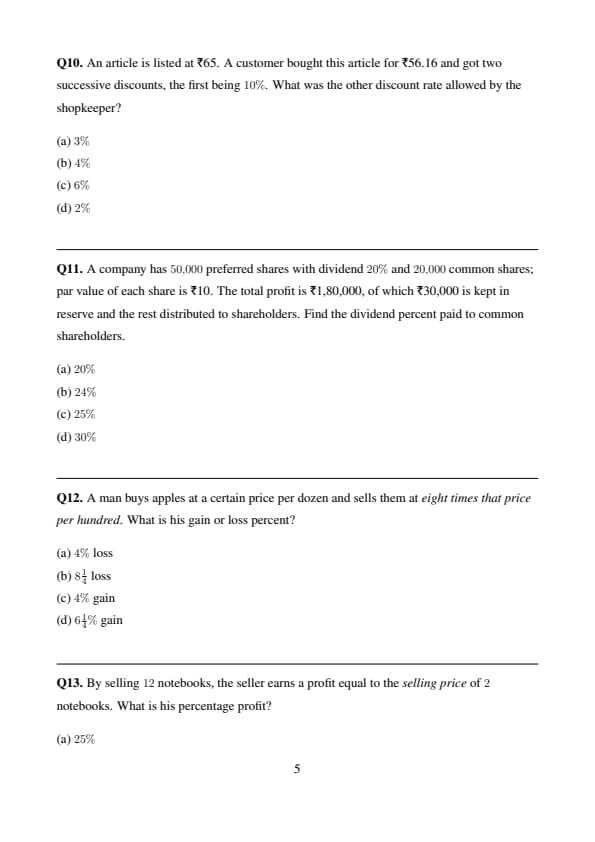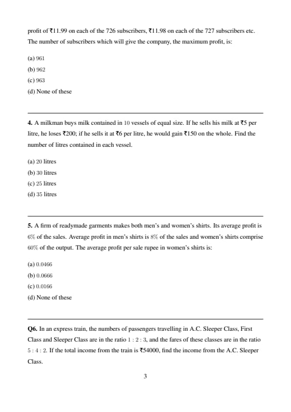 A firm of readymade garments makes both men’s and women’s shirts. Its average profit is \(6%\) of the sales. Average profit in men’s shirts is \(8%\) of the sales and women’s shirts comprise \(60%\) of the output. The average profit per sale rupee in women’s shirts is: