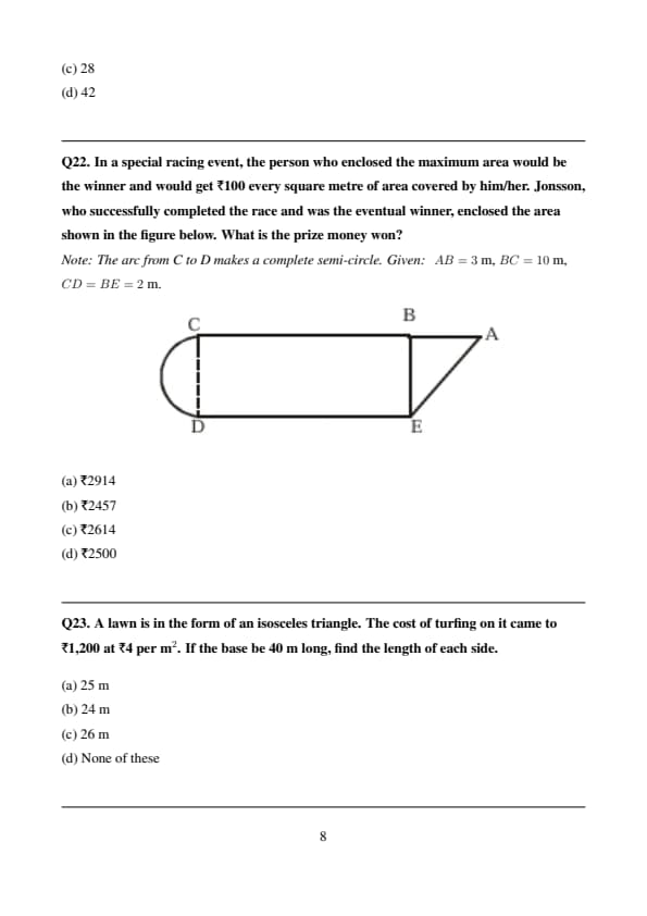 In a special racing event, the person who enclosed the maximum area would be the winner and would get Rs. 100 every square metre of area covered by him/her. Jonsson, who successfully completed the race and was the eventual winner, enclosed the area shown in the figure below. What is the prize money won?