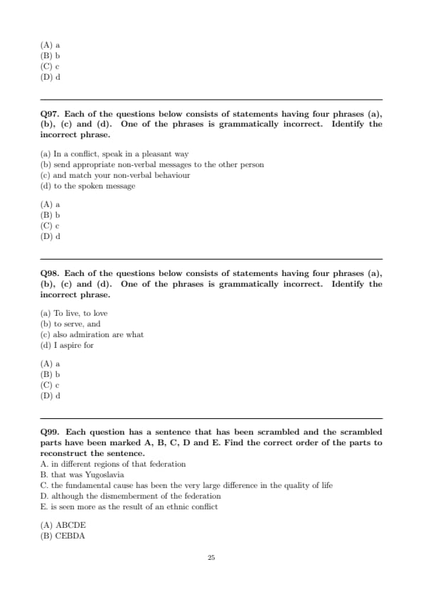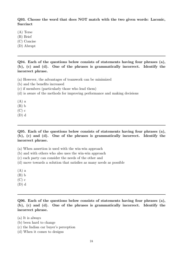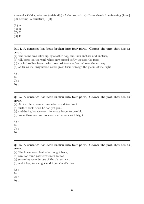In each of these questions, each sentence has four words or phrases in braces marked A, B, C, and D. Choose one word or phrase that must be changed for the sentence to be correct.