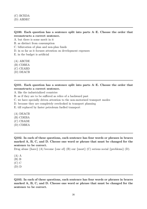 Each question has a sentence split into parts A–E. Choose the order that reconstructs a correct sentence.