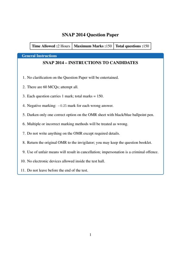 The SNAP 2014 Question Paper is now available for download with answer key and detailed solutions PDF. SNAP is conducted as a computer‑based test and divided into three sections: General English, Quantitative, Data Interpretation & Logical Reasoning. There is no sectional time limit, and each correct answer is awarded one mark, while each incorrect answer incurs a penalty of 0.25 marks.