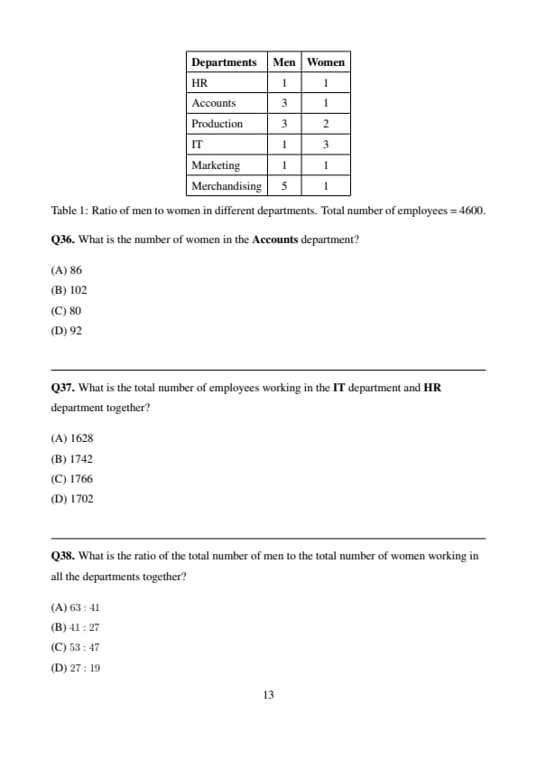What is the ratio of the total number of men to the total number of women working in all the departments together?