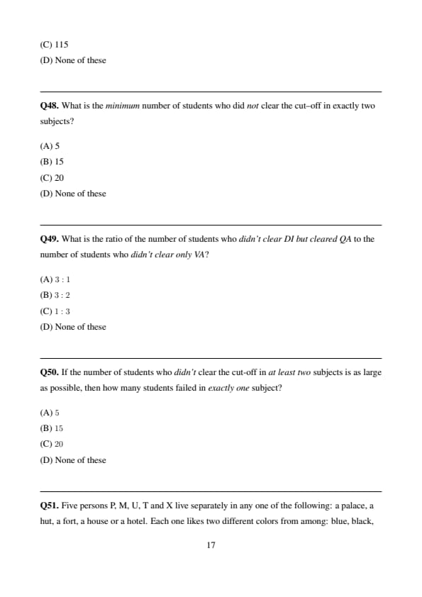 In a school students at Pioneer Career Kolkata wrote a Mock test with three subjects DI, VA and QA. Results: \(80\) students cleared the cut–off in DI, \(70\) in VA and \(60\) in QA. Only \(40\) students cleared all three. \(10\) students failed to clear the cut–off in even one subject (i.e., cleared none). \(50\) students cleared the cut–off in VA and QA (together). \(5\) students cleared the cut–off in only QA. What is the minimum number of students who appeared in the Mock test?