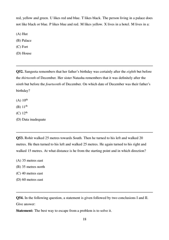 Five persons P, M, U, T and X live separately in any one of the following: a palace, a hut, a fort, a house or a hotel. Each one likes two different colors from among: blue, black, red, yellow and green. U likes red and blue. T likes black. The person living in a palace does not like black or blue. P likes blue and red. M likes yellow. X lives in a hotel. M lives in a: