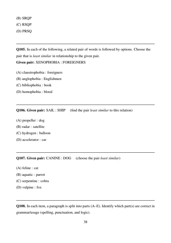 \[ \boxed{(A) is least similar} \] Quick Tip: When the base pair is part–whole, eliminate choices where the first item cannot plausibly be a component or constituent of the second in real life.