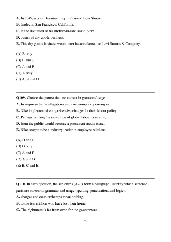 In each question, the sentences (A–E) form a paragraph. Identify which sentence parts are correct in grammar and usage (spelling, punctuation, and logic).