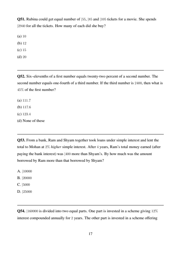 Rubina could get equal number of \(Rs. 55\), \(Rs. 85\) and \(Rs. 105\) tickets for a movie. She spends \(Rs. 2940\) for all the tickets. How many of each did she buy?