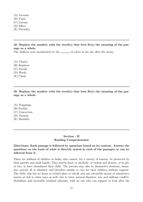 We have regular elections and our political space teems with parties subscribing to a ______ (49) of ideologies. But is this space sufficiently democratic so that people get the leaders they deserve? A range of identities such as family, clan, caste, religion influences our choice of leaders more than their understanding of public policy. Beneath ______ (50) of democracy, the old social order, where caste was privileged over merit, has survived, though in a weaker form.