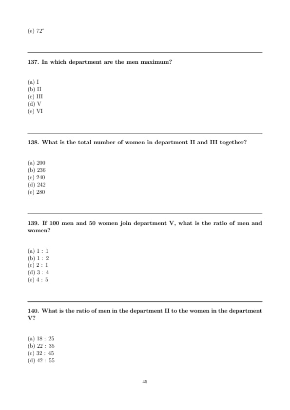 Thus, the ratio of men in department II to women in department V is: \[ \frac{65}{54} = \frac{18}{25}. \] Quick Tip: When calculating ratios, ensure you round the values appropriately based on the problem's context.