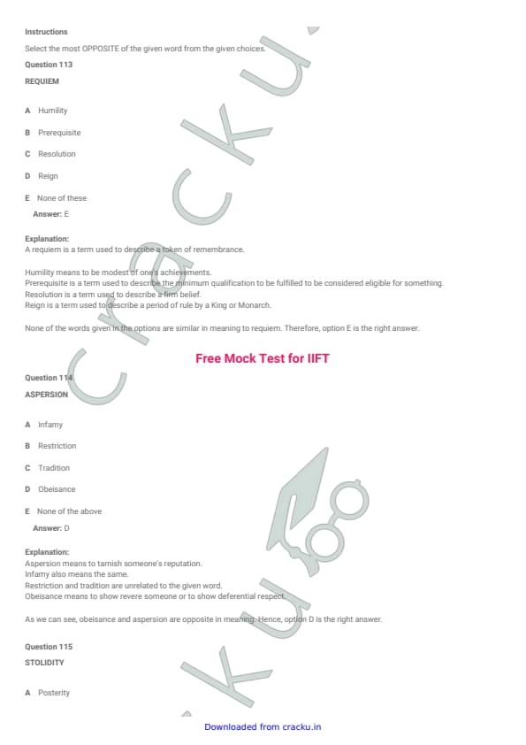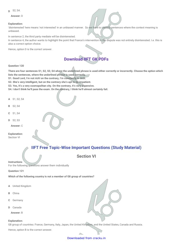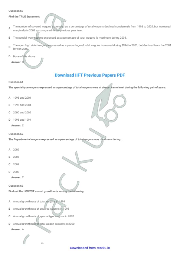 IIFT 2008 Question paper with answer key pdf is available for download. The exam was successfully organized by Indian Institute of Foreign Trade, New Delhi (IIFT). In terms of difficulty level, IIFT was of Easy to Moderate level. The question paper comprised a total of 150 MCQs questions divided among six sections. [PDF Source: cracku.in]
