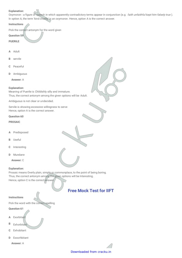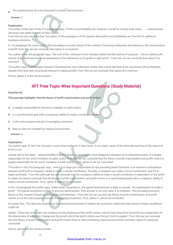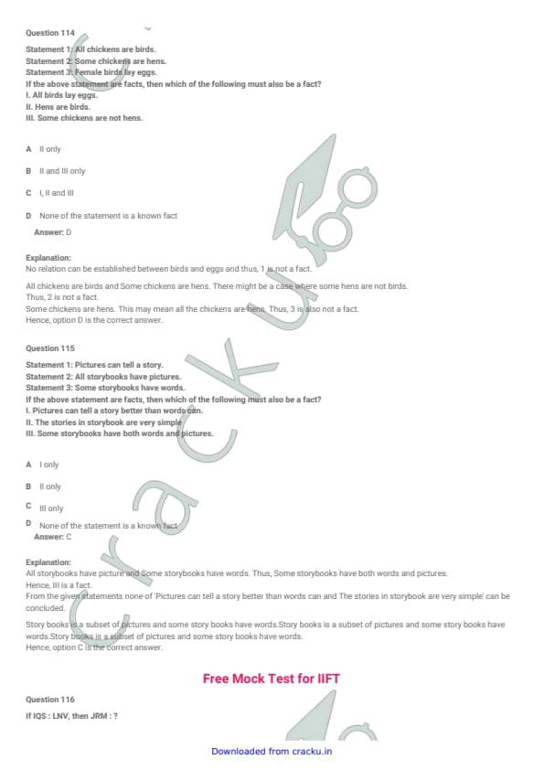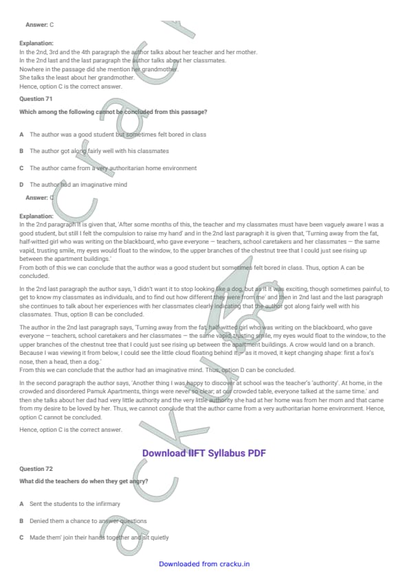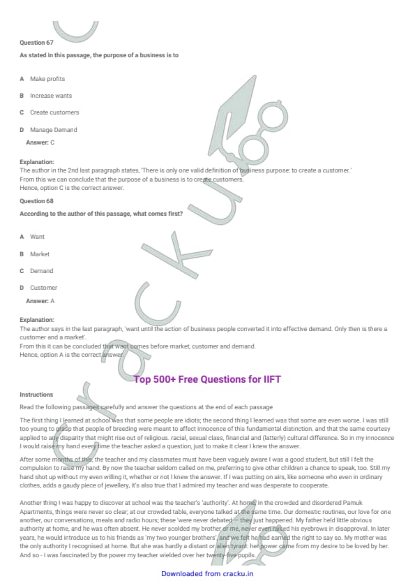 IIFT 2012 Question paper with answer key pdf conducted on November 27, 2011 is available for download. The exam was successfully organized by Indian Institute of Foreign Trade, New Delhi (IIFT). The question paper comprised a total of 128 questions.[PDF Source: cracku.in]