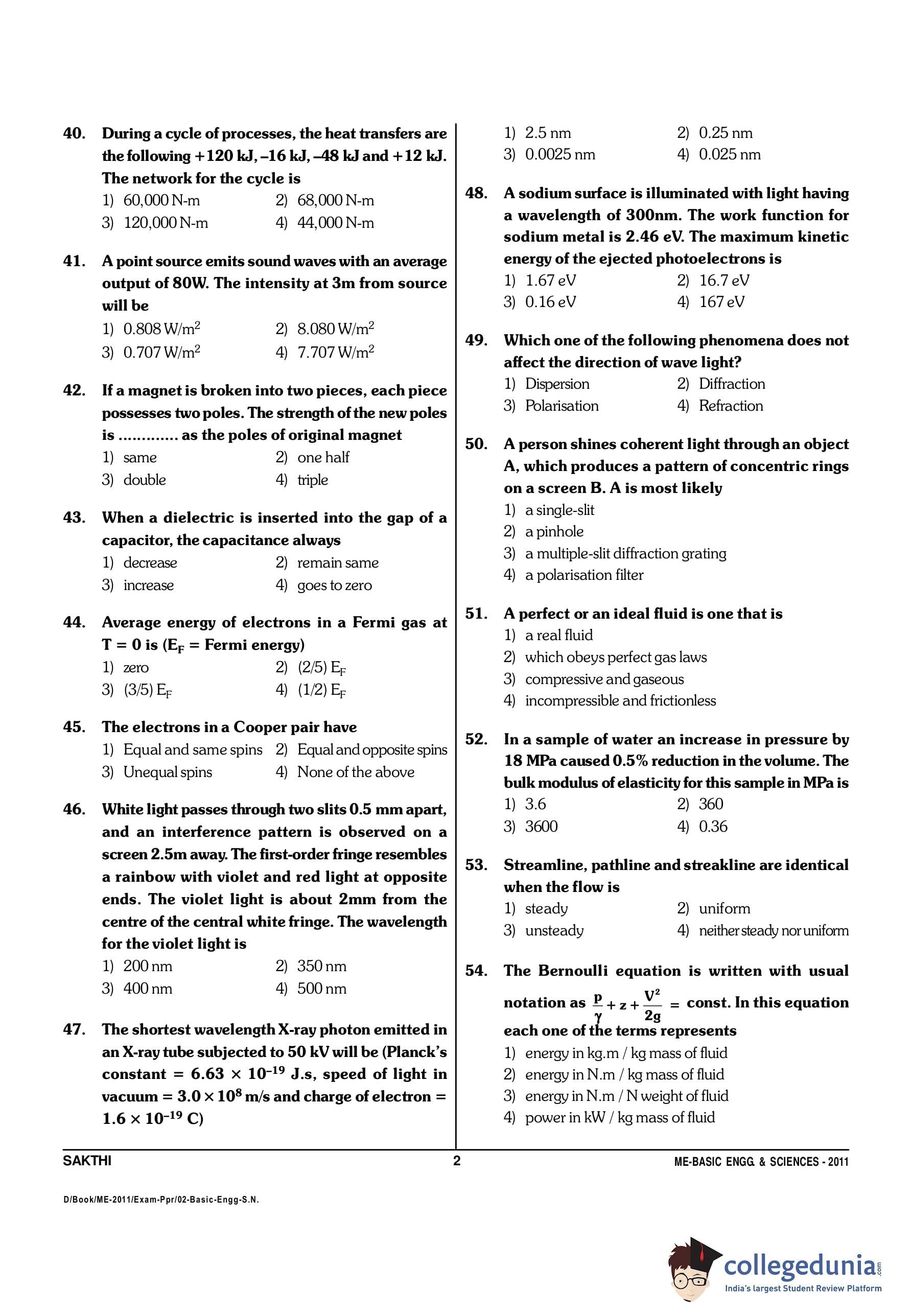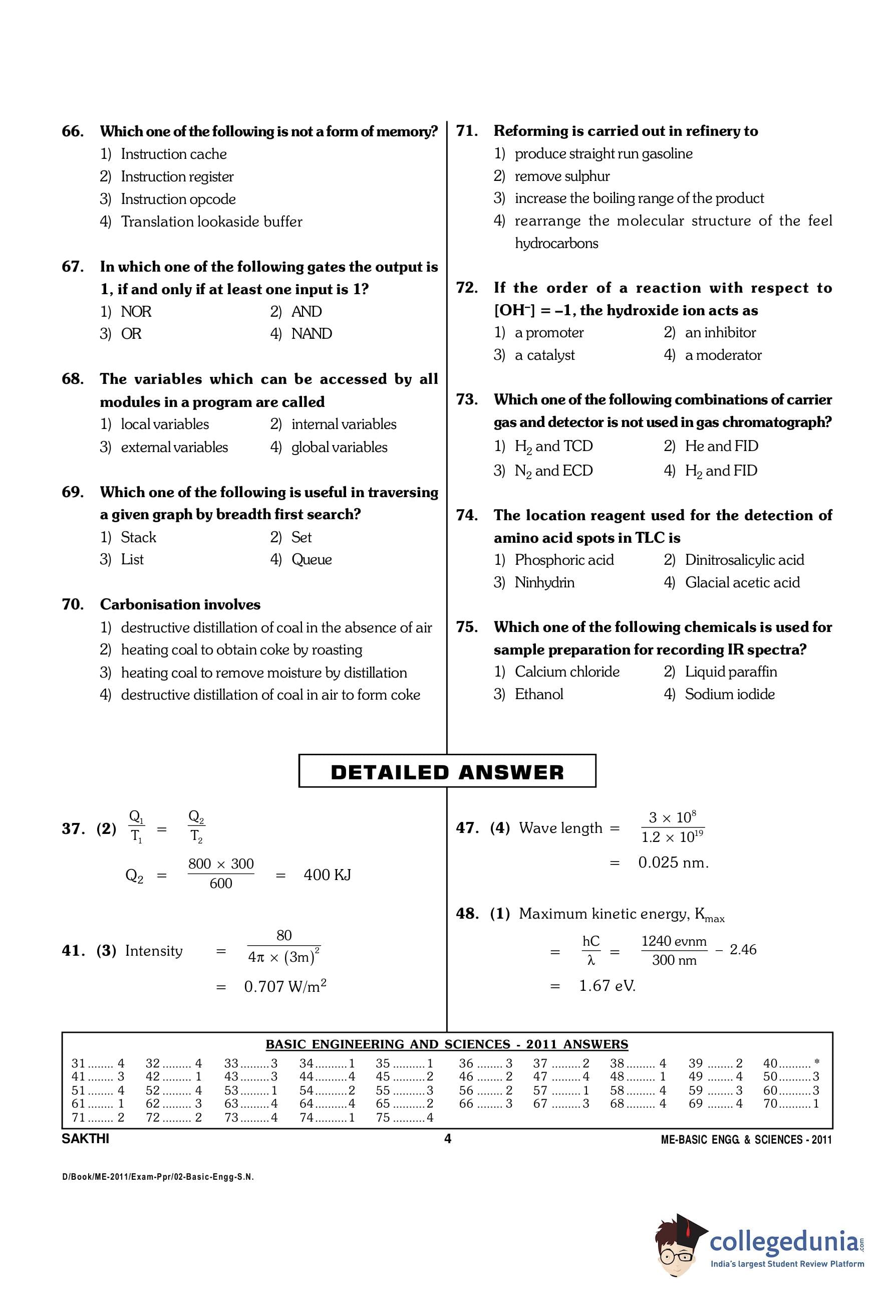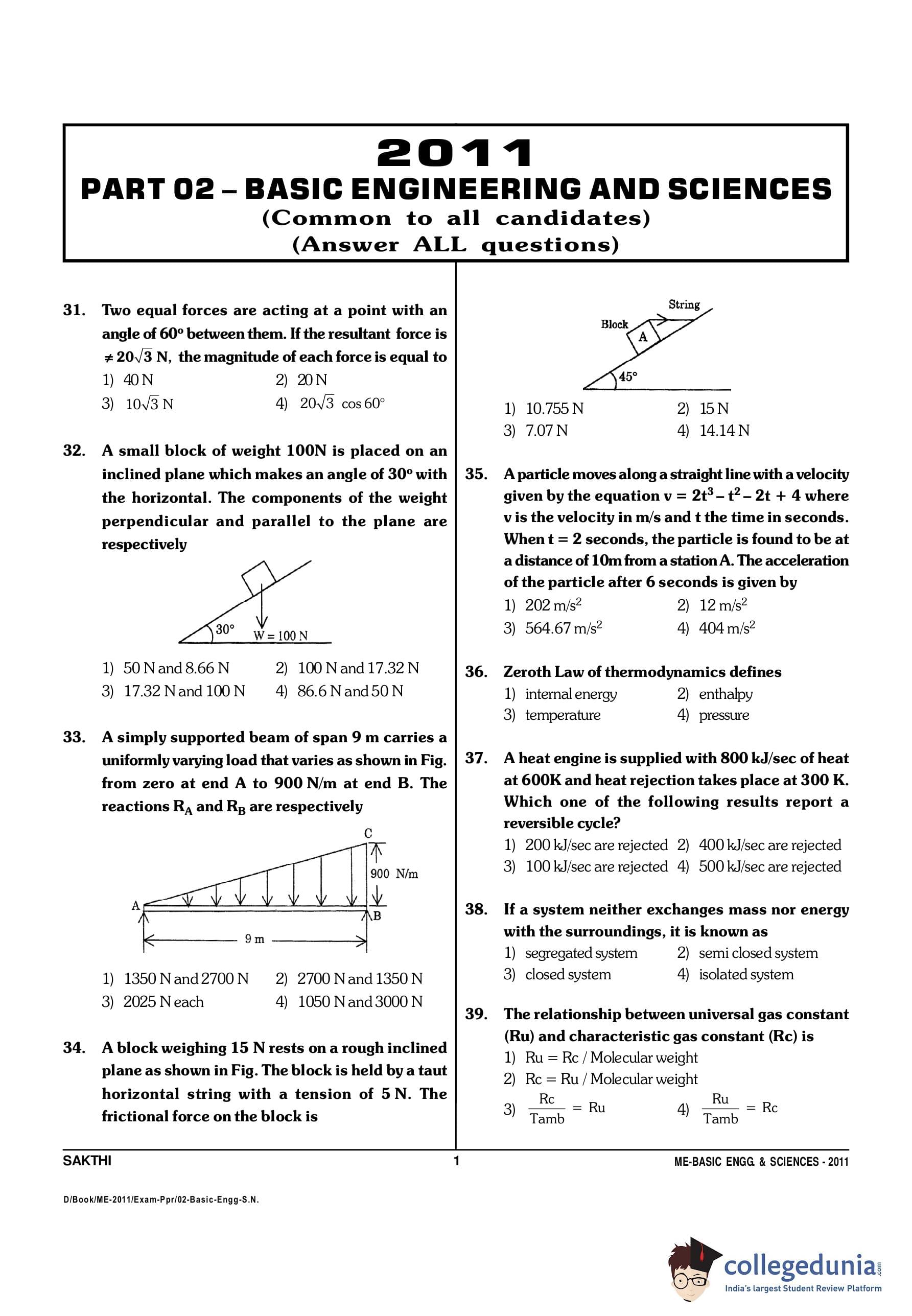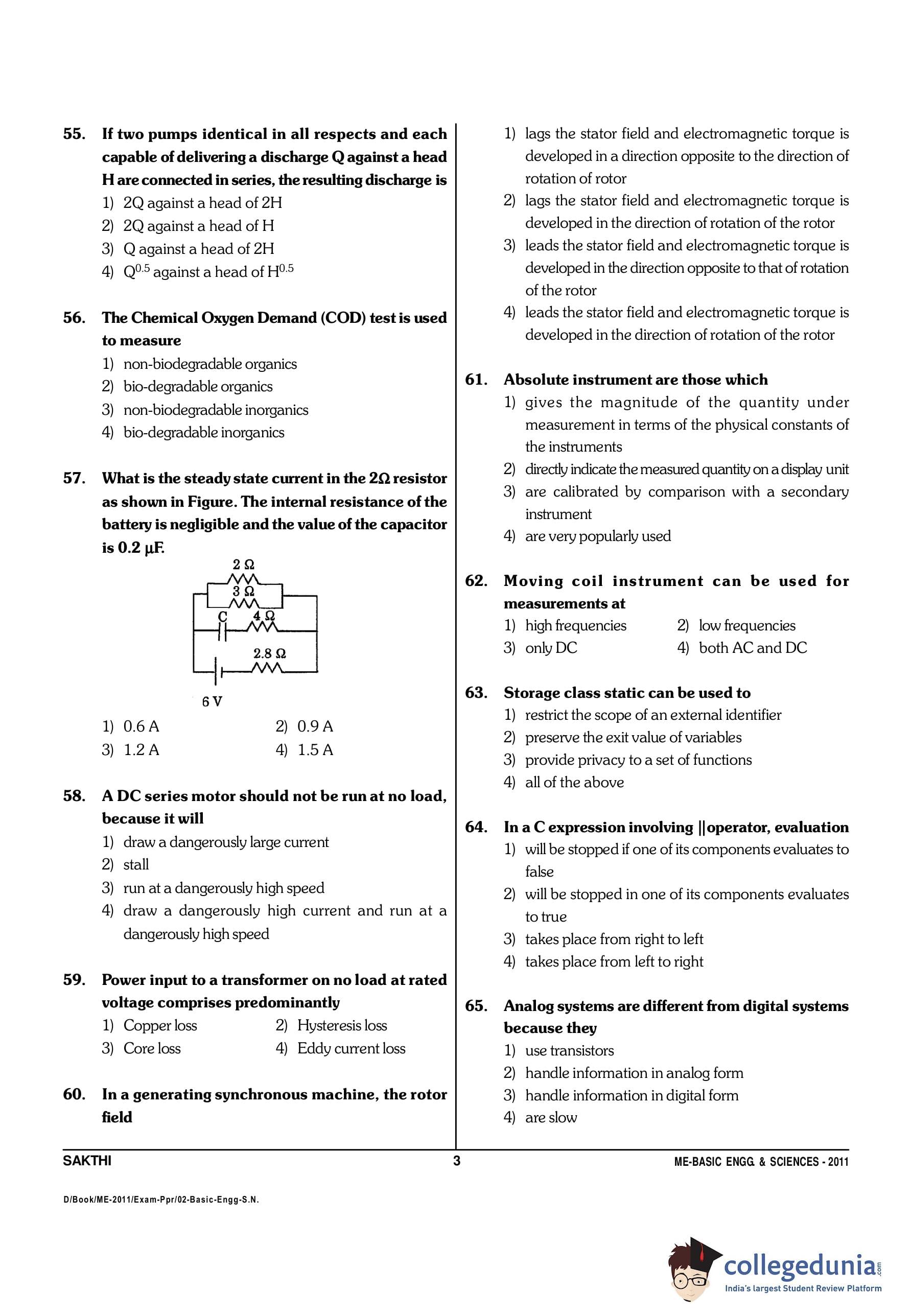 TANCET 2011 Basic Engineering and Sciences Question Paper with Answer Key PDF
