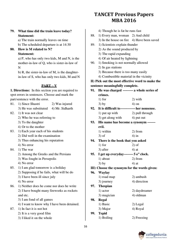 TANCET 2016 MBA Question Paper with Answer Key PDFs