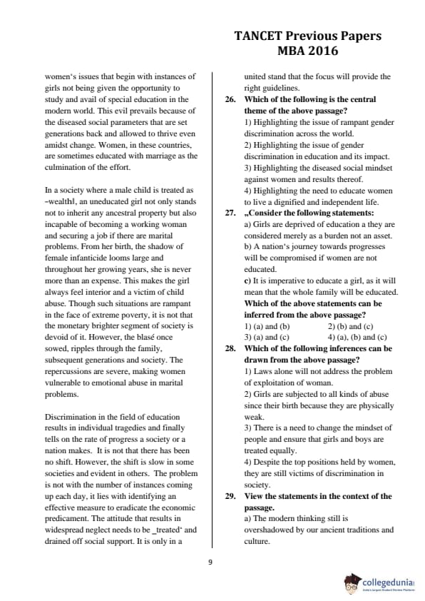 TANCET 2016 MBA Question paper with answer key pdf conducted on June 12, 2016 is available for download. The exam was successfully organized by ANNA University. The question paper comprised a total of 100 questions.