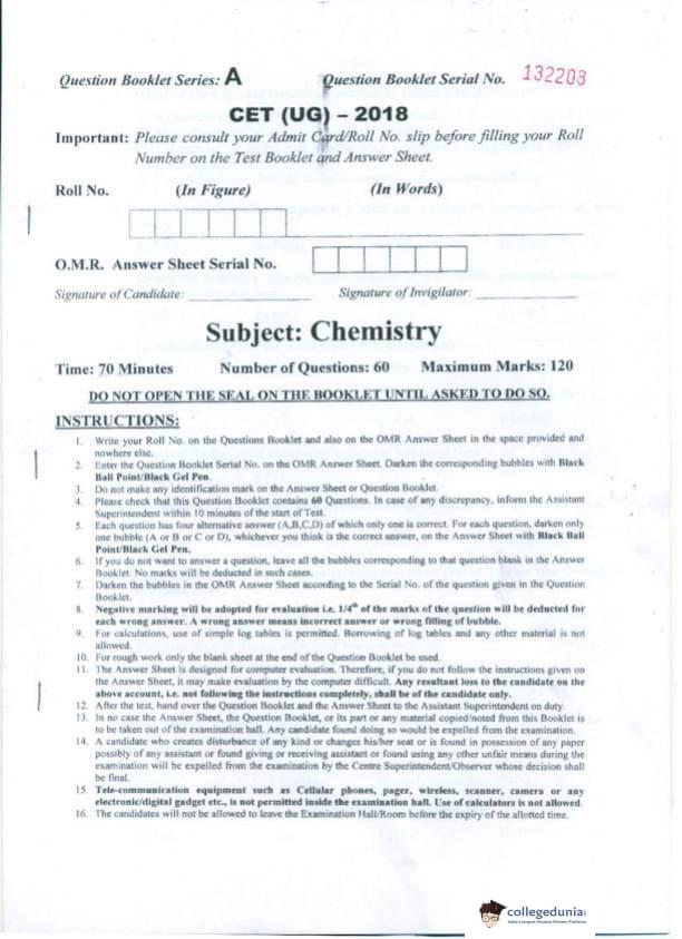 PU CET 2018 Chemistry Question Paper with Answer Key PDFs