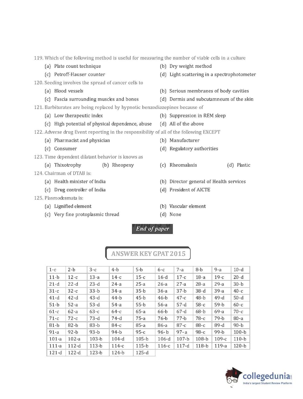 GPAT 2015 Question paper with answer key pdf conducted on Feb-23 is available for download. The exam was successfully organized by All India Council for Technical Education (AICTE). The question paper comprised a total of 125 questions.