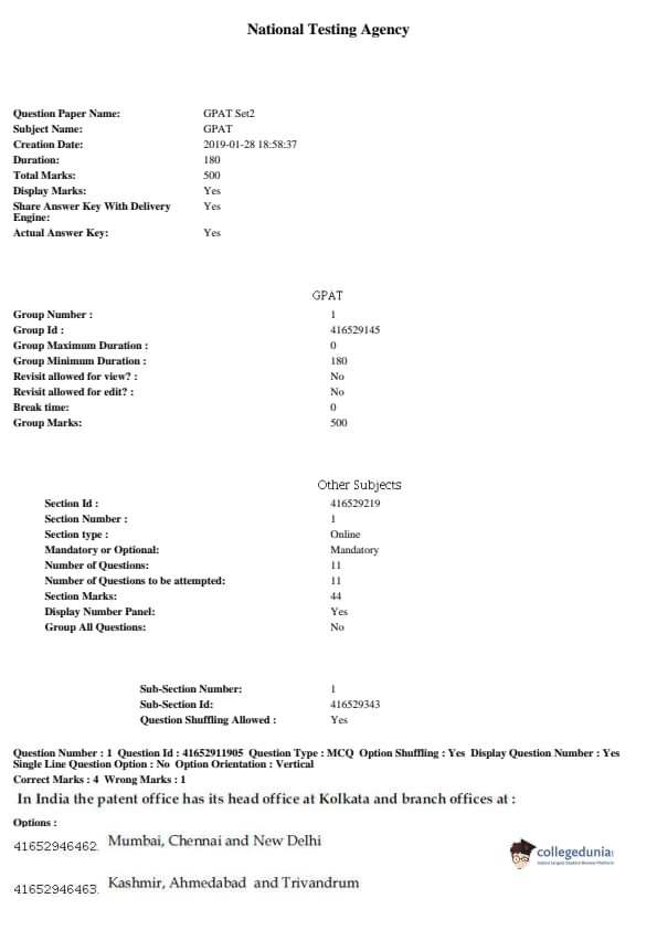 GPAT 2019 Question paper with answer key pdf conducted on Jan-28 in Afternoon Session 2:30 PM to 5:30 PM for Set 2 is available for download. The exam was successfully organized by National Testing Agency. The question paper comprised a total of 125 questions.
