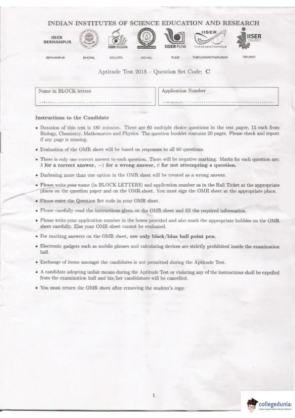 IISER 2018 Question paper with answer key pdf for Set C is available for download. The exam was successfully organized by Indian Institute of Science Education and Research. The question paper comprised a total of 60 questions divided among 4 sections.