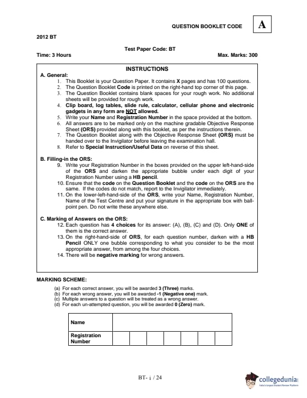 IIT JAM 2012 Biotechnology (BT) Question paper with answer key pdf conducted on February 12 in Afternoon Session 2 PM to 5 PM is available for download. The exam was successfully organized by IIT Bombay. The question paper comprised a total of 100 questions.