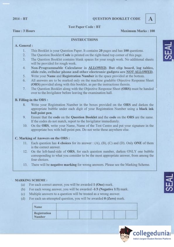 IIT JAM 2014 Biotechnology (BT) Question paper with answer key pdf conducted on February 9 in Forenoon Session 9 AM to 12 PM is available for download. The exam was successfully organized by IIT Kanpur. The question paper comprised a total of 100 questions.