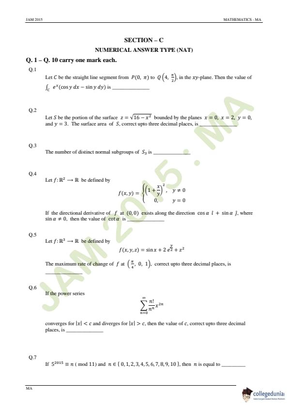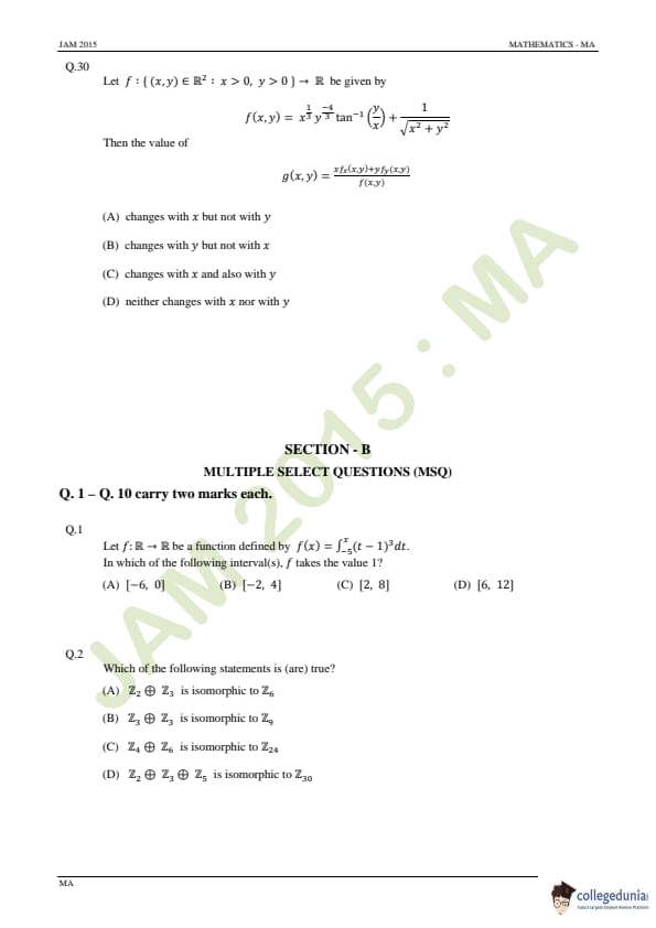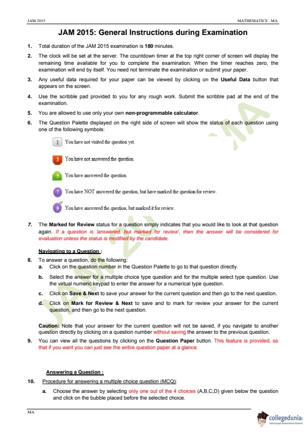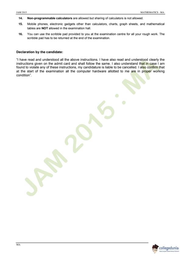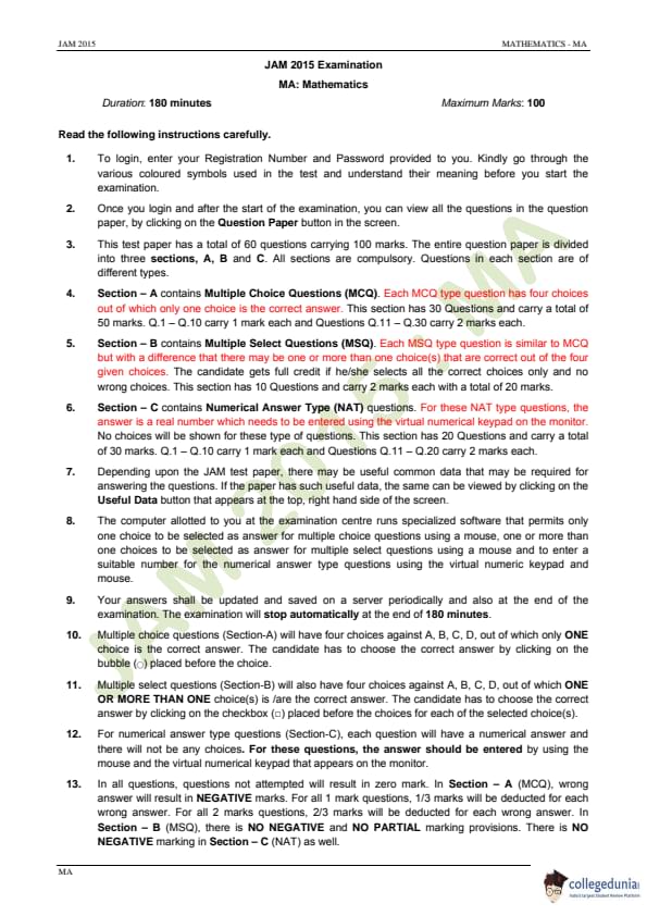 IIT JAM 2015 Mathematics (MA) Question paper with answer key pdf conducted on February 8 in Forenoon Session 9 AM to 12 PM is available for download. The exam was successfully organized by IIT Guwahati. The question paper comprised a total of 60 questions divided among 3 sections.