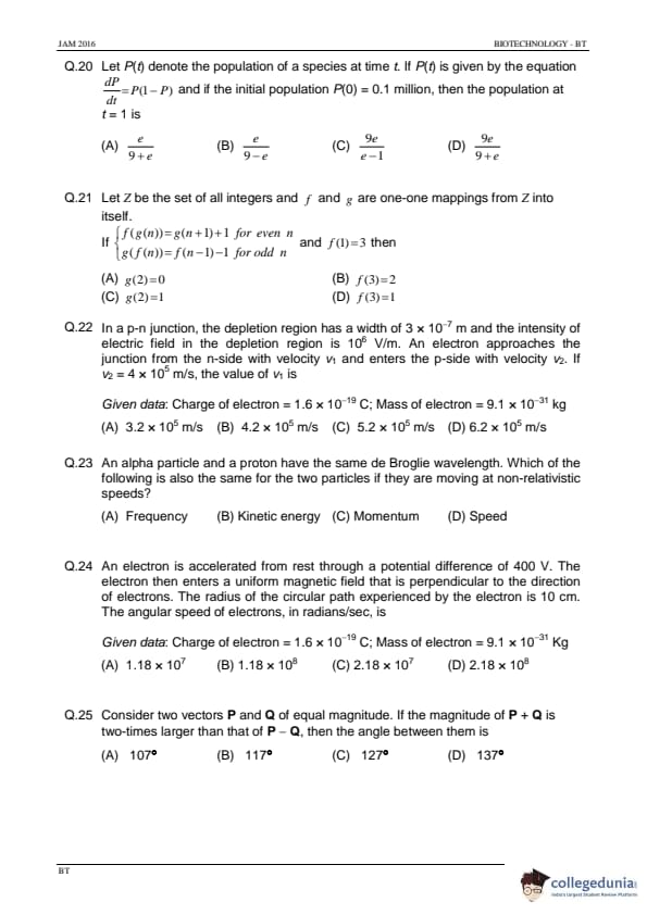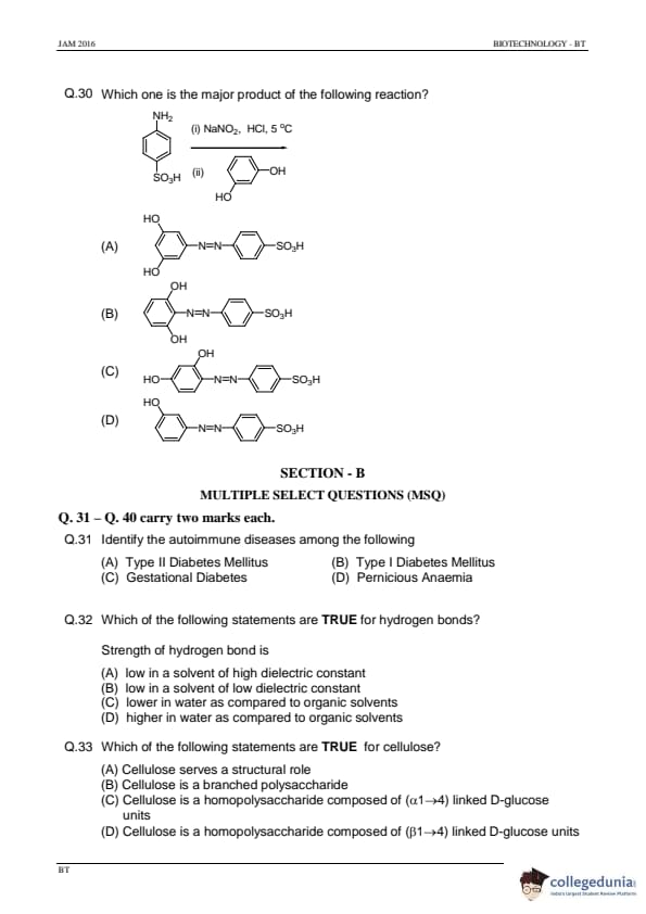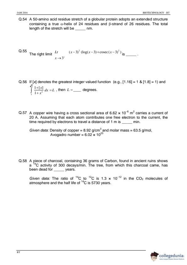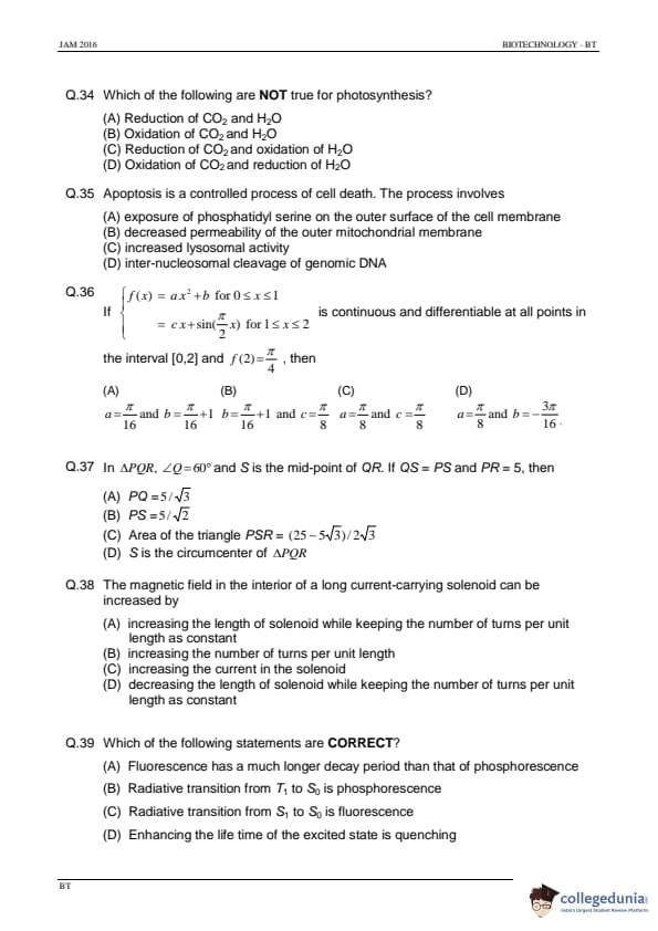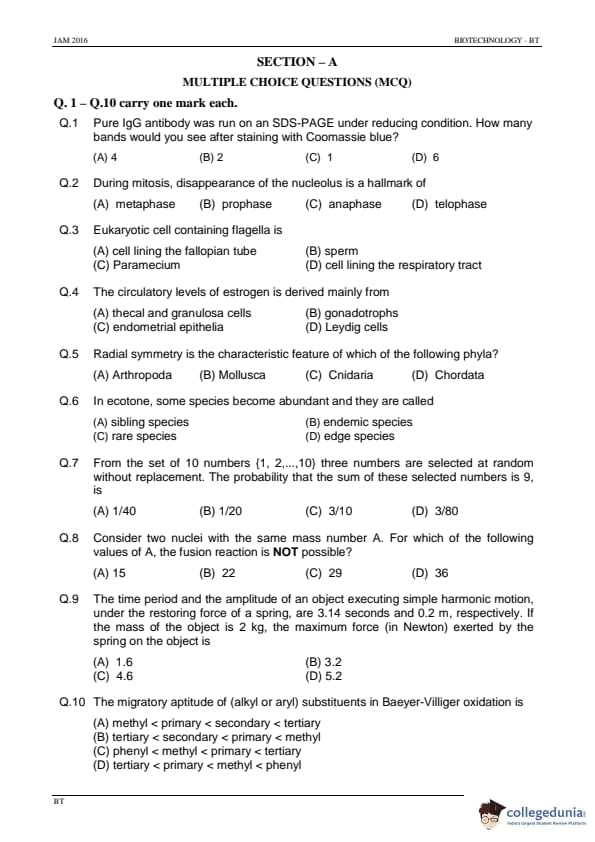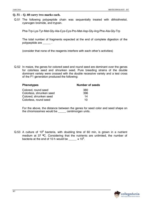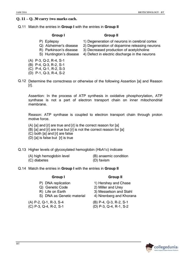 IIT JAM 2016 Biotechnology (BT) Question Paper with Answer Key PDFs Afternoon Session