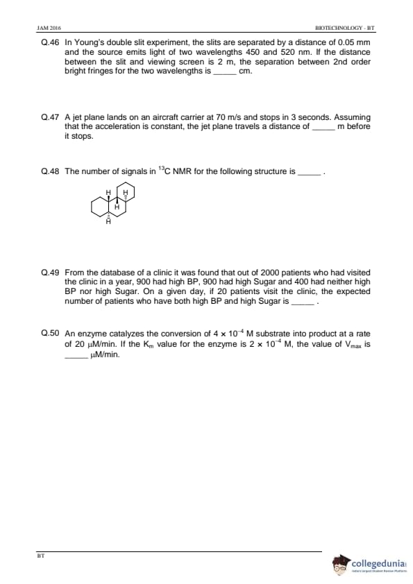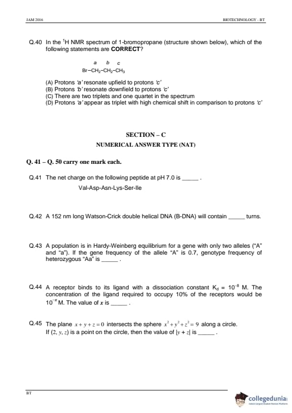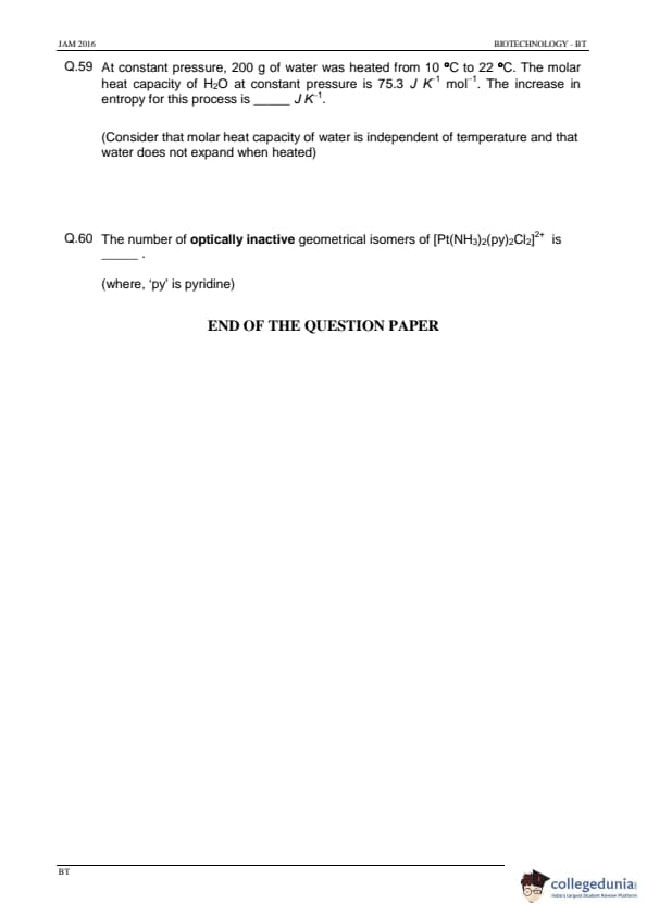 IIT JAM 2016 Biotechnology (BT) Question paper with answer key pdf conducted on February 7 in Afternoon Session 2 PM to 5 PM is available for download. The exam was successfully organized by IIT Madras. The question paper comprised a total of 60 questions divided among 3 sections.