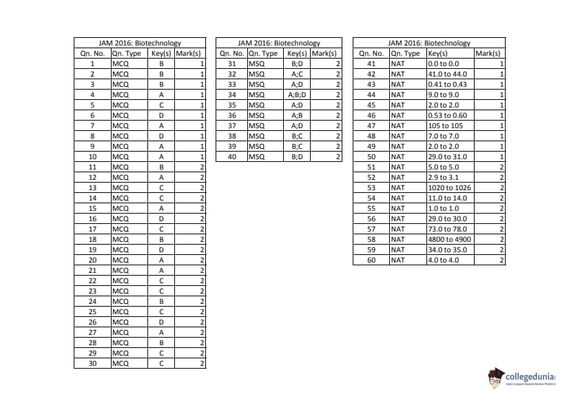| IIT JAM 2016 Biotechnology (BT) Question Paper PDF | IIT JAM 2016 Biotechnology (BT) Answer Key PDF |