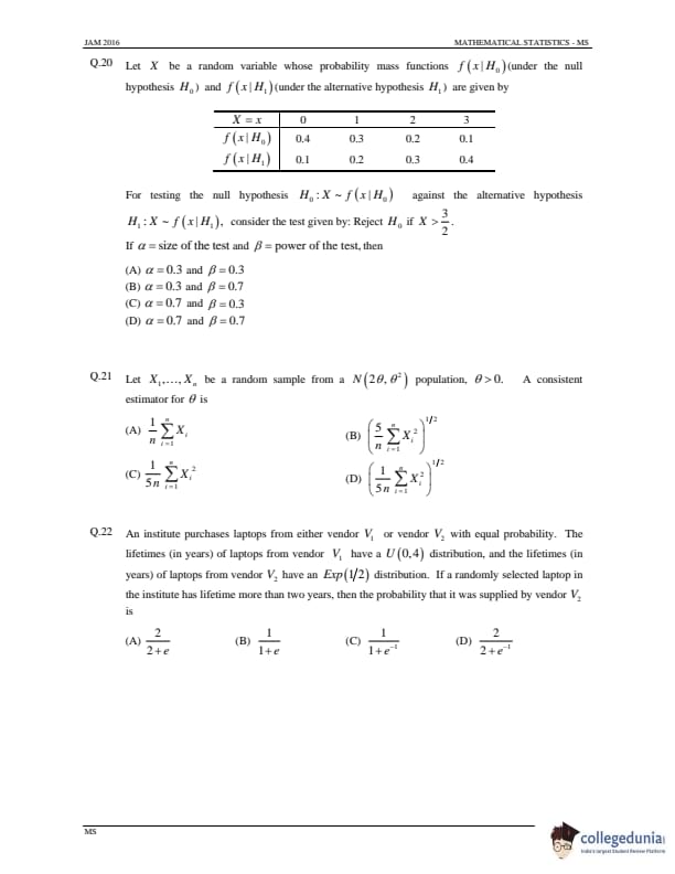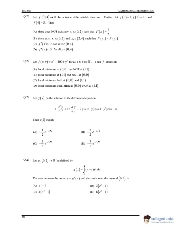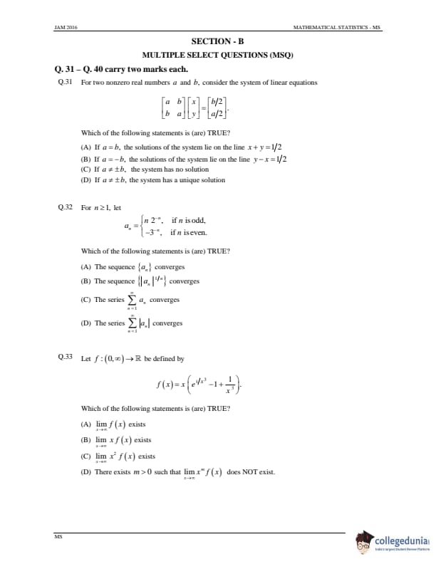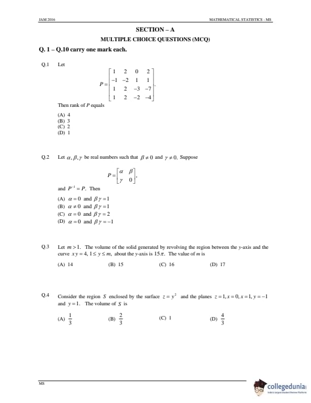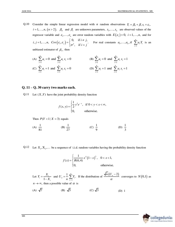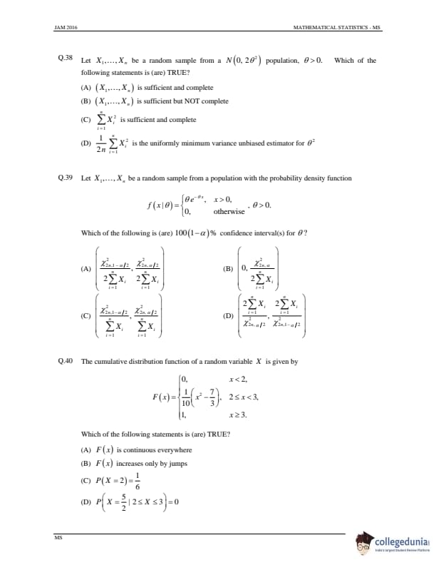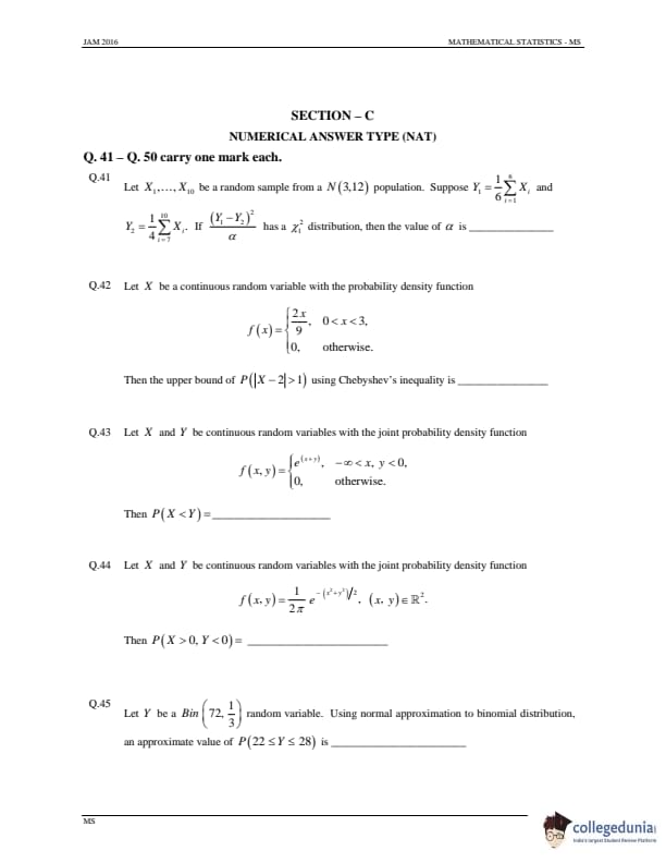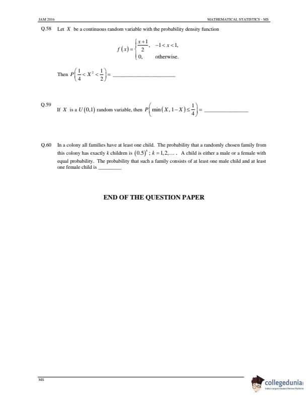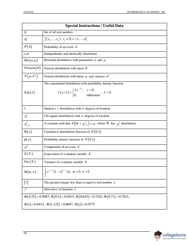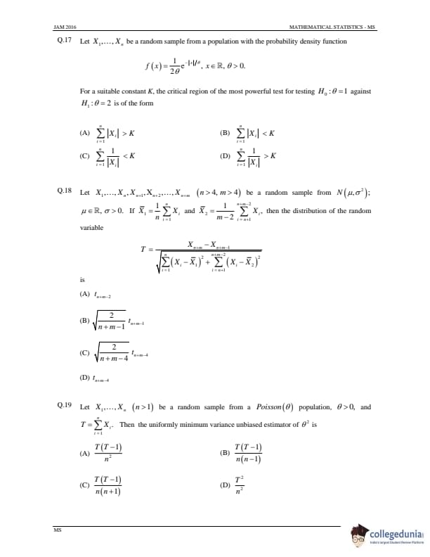 IIT JAM 2016 Mathematical Statistics (MS) Question paper with answer key pdf conducted on February 7 in Afternoon Session 2 PM to 5 PM is available for download. The exam was successfully organized by IIT Madras. The question paper comprised a total of 60 questions divided among 3 sections.