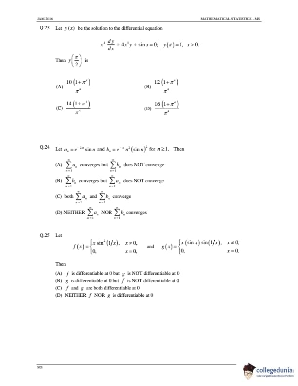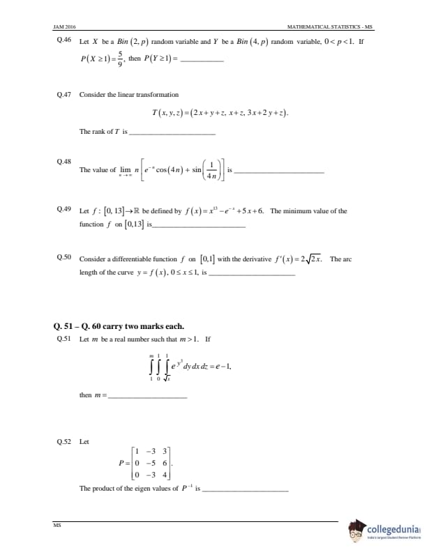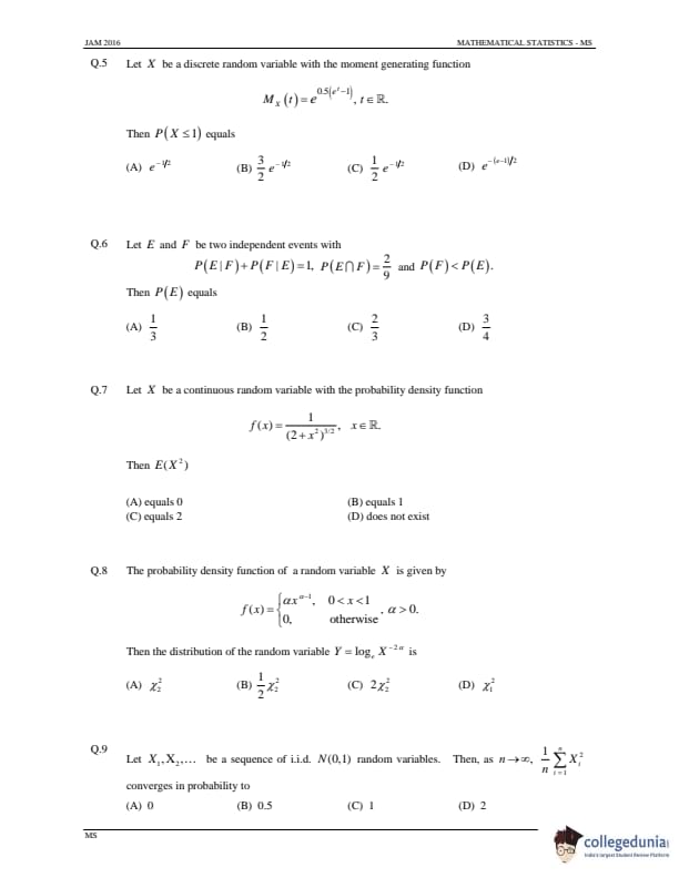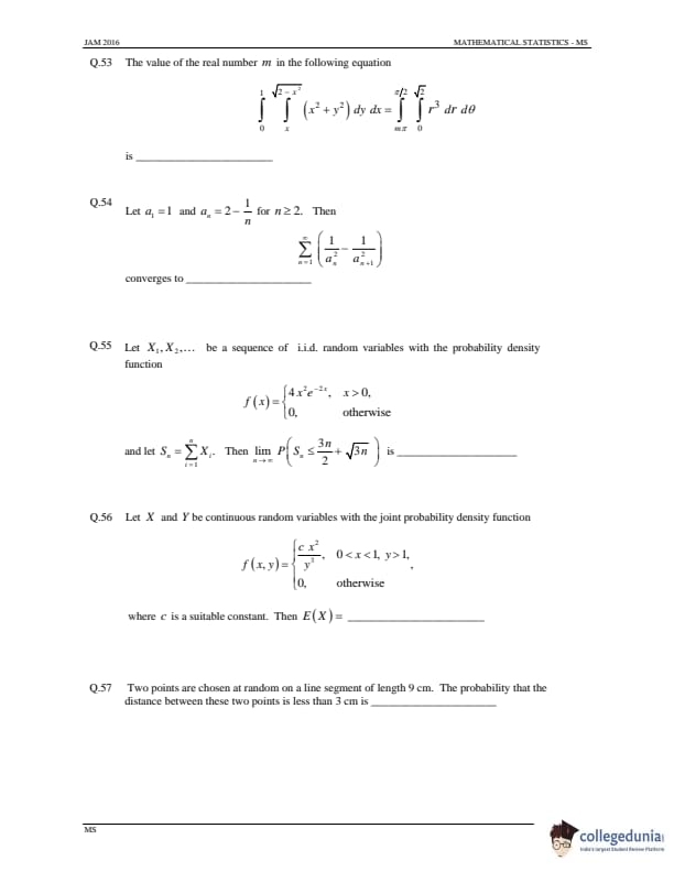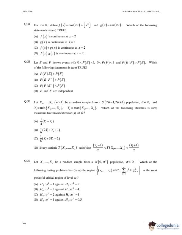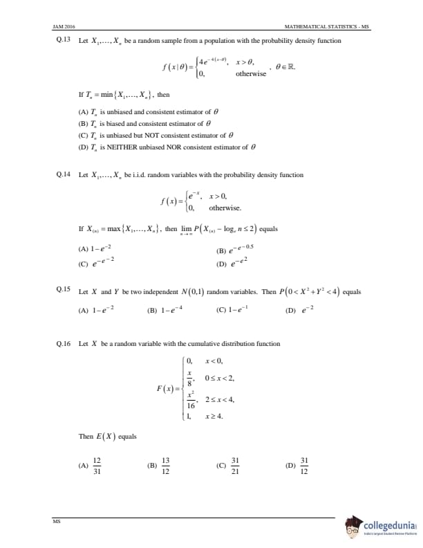 IIT JAM 2016 Mathematical Statistics (MS) Question Paper with Answer Key PDFs Afternoon Session