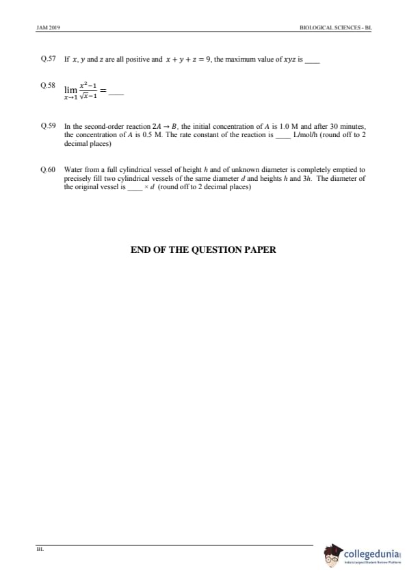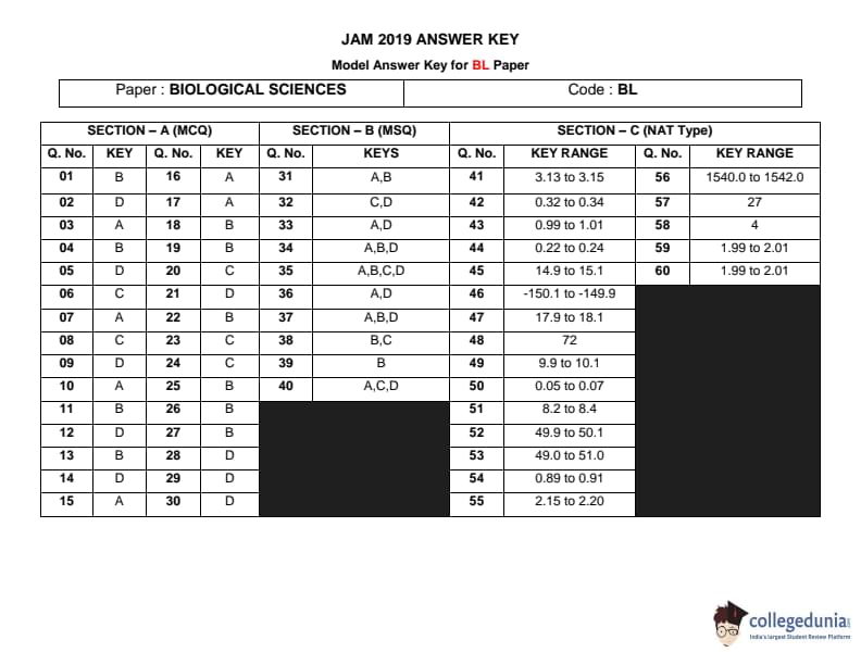 IIT JAM 2019 Biological Sciences (BL) Question paper with answer key pdf conducted on February 10 in Forenoon Session 9 AM to 12 PM is available for download. The exam was successfully organized by IIT Kharagpur. The question paper comprised a total of 60 questions divided among 3 sections.