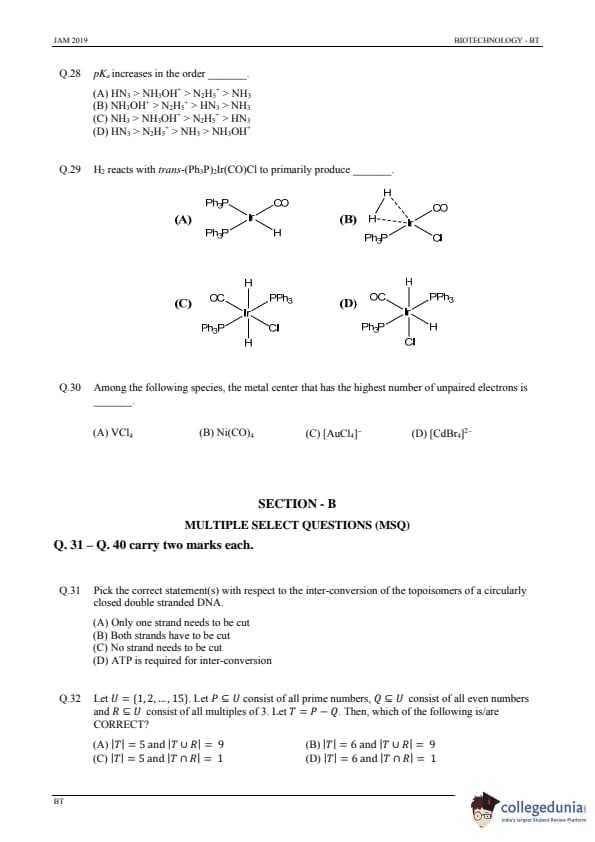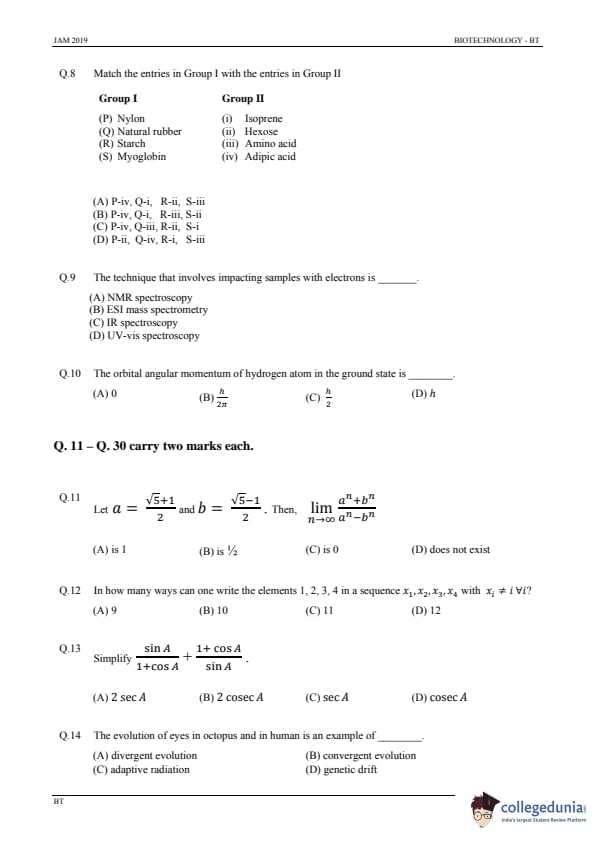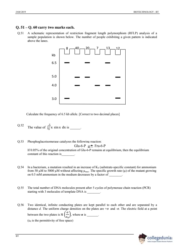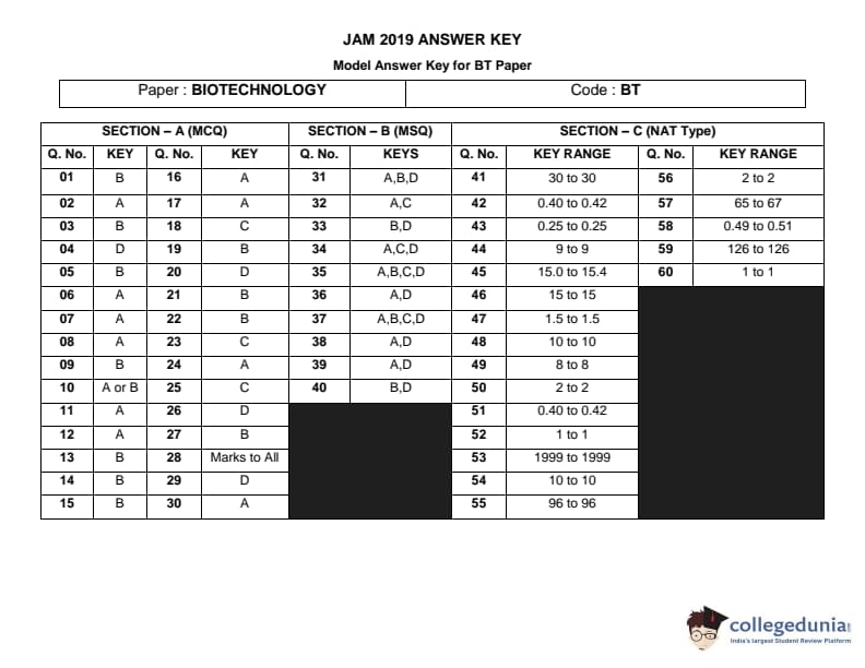 IIT JAM 2019 Biotechnology (BT) Question paper with answer key pdf conducted on February 10 in Afternoon Session 2 PM to 5 PM is available for download. The exam was successfully organized by IIT Kharagpur. The question paper comprised a total of 60 questions divided among 3 sections.