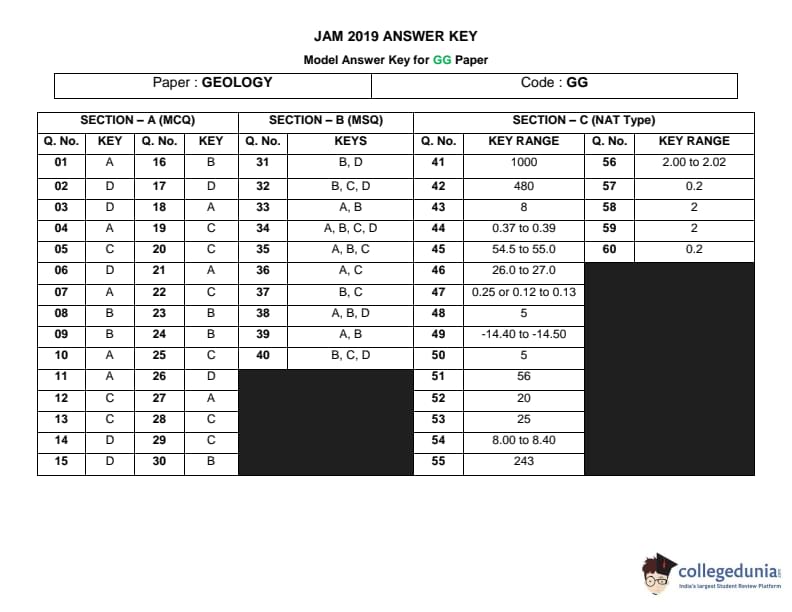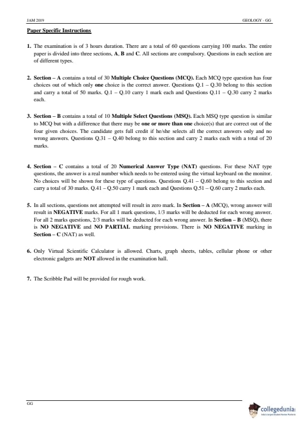 IIT JAM 2019 Geology (GG) Question paper with answer key pdf conducted on February 10 in Afternoon Session 2 PM to 5 PM is available for download. The exam was successfully organized by IIT Kharagpur. The question paper comprised a total of 60 questions divided among 3 sections.